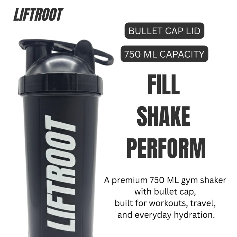 Buy LIFTROOT 750ml protein shaker bottle made from BPA-free food-grade plastic. Leak-proof bullet cap design, perfect for gym, workout & fitness.